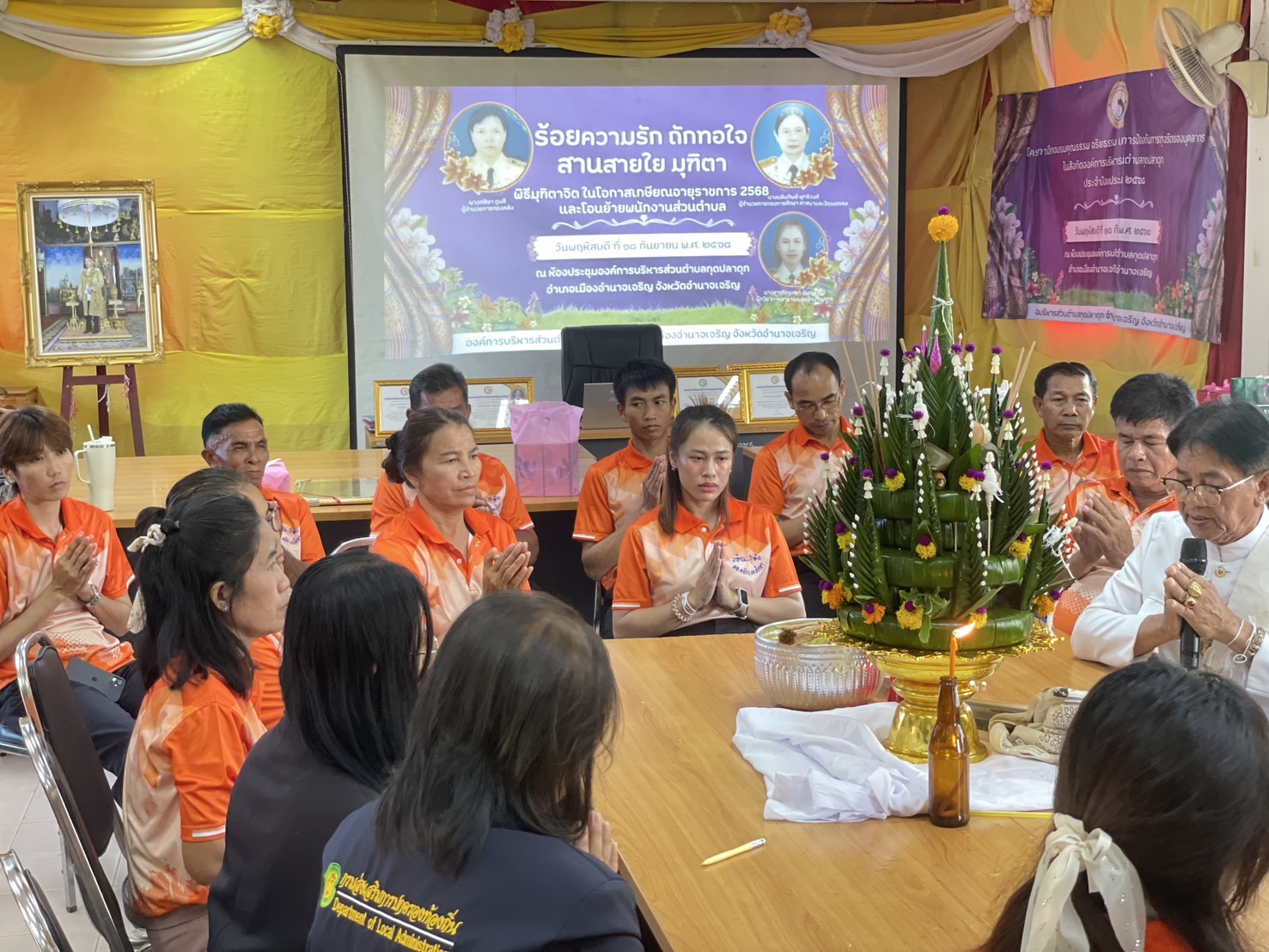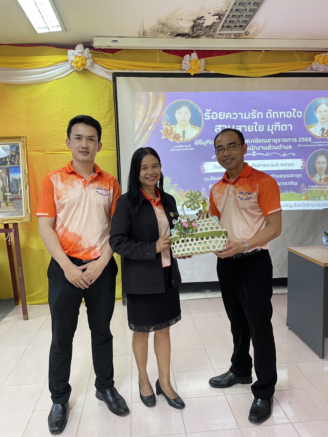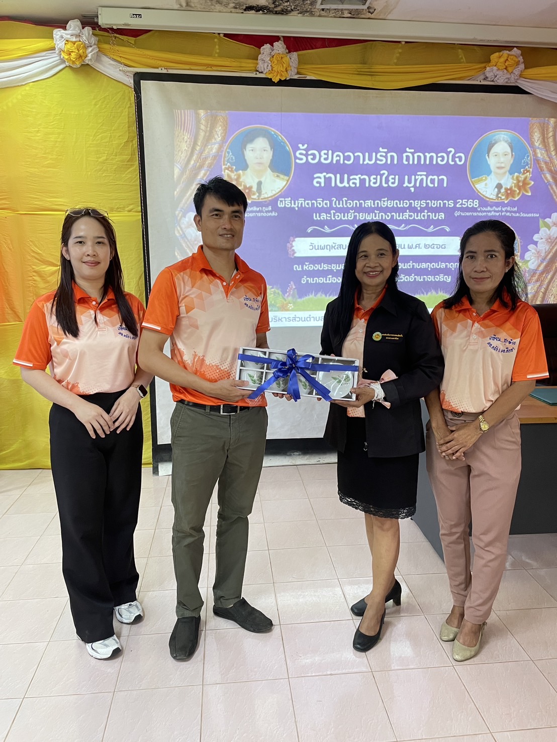 วันพฤหัสบดี, 18 กันยายน 2568 16:02วันที่ 18 กันยายน 2568 องค์การบริหารส่วนตำบลกุดปลาดุก นำโดย นายอนุชา พรมทา นายกองค์การบริหารส่วนตำบลกุดปลาดุก พร้อมด้วยผู้บริหาร หัวหน้าส่วนราชการ พนักงานส่วนตำบล และพนักงานจ้าง จัดพิธีบายศรีสู่ขวัญให้กับนางนลินทิพย์ พุทธิวงศ์ ผู้อำนวยการสถานศึกษา และนางศลิษา ภูมลี เนื่องในโอกาสเกษียณอายุราชการ ประจำปีการศึกษา 2568 โดยมี เจ้าหน้าที่ อบต.กุดปลาดุก คณะครู ร่วมผูกแขนบายศรีสู่ขวัญ พร้อมมอบของที่ระลึก เสริมสร้างกำลังใจแก่ผู้เกษียณอายุ เพื่อเป็นการรำลึกคุณความดี และเพื่อเป็นการแสดงความขอบคุณ ยกย่อง เชิดชูเกียรติให้ปรากฏ และจารึกไว้ในความทรงจำ เป็นต้นแบบที่ดี ณ ห้องประชุม องค์การบริหารส่วนตำบลกุดปลาดุก อำเภอเมืองอำนาจเจริญ จังหวัดอำนาจเจริญ