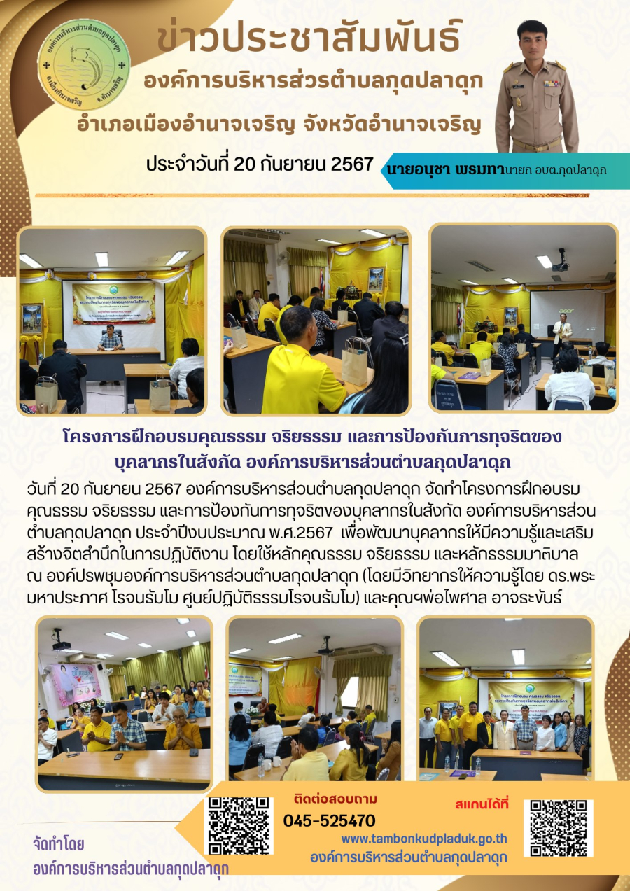 โครงการฝึกอบรมคุณธรรม จริยธรรม และการป้องกันการทุจริตของบุคลากรในสังกัด องค์การบริหารส่วนตำบลกุดปลาดุก อำเภอเมืองอำนาจเจริญ จังหวัดอำนาจเจริญ