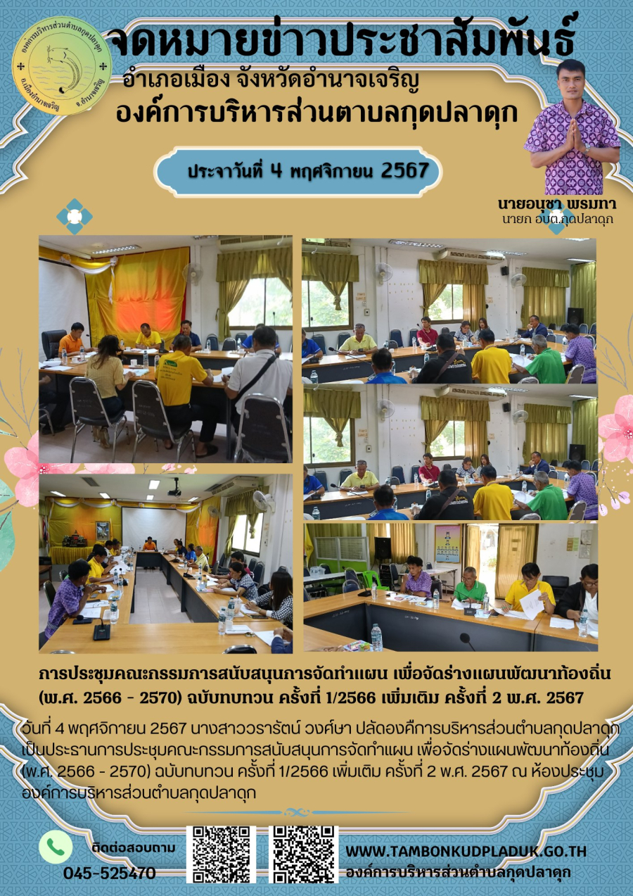 วันที่ 4 พฤศจิกายน 2567 นางสาววรารัตน์ วงศ์ษา ปลัดองค์การบริหารส่วนตำบลกุดปลาดุก เป็นประธานการประชุมคณะกรรมการสนับสนุนการจัดทำแผน เพื่อจัดร่างแผนพัฒนาท้องถิ่น (พ.ศ. 2566 - 2570) ฉบับทบทวน ครั้งที่ 1/2566 เพิ่มเติม ครั้งที่ 2 พ.ศ. 2567 ณ ห้องประชุมองค์การบริหารส่วนตำบลกุดปลาดุก